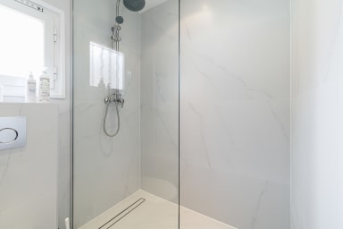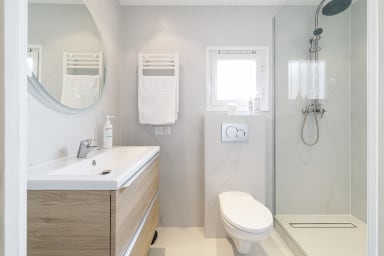 La salle de bain moderne est équipée d'une douche à l'italienne et de toilettes.